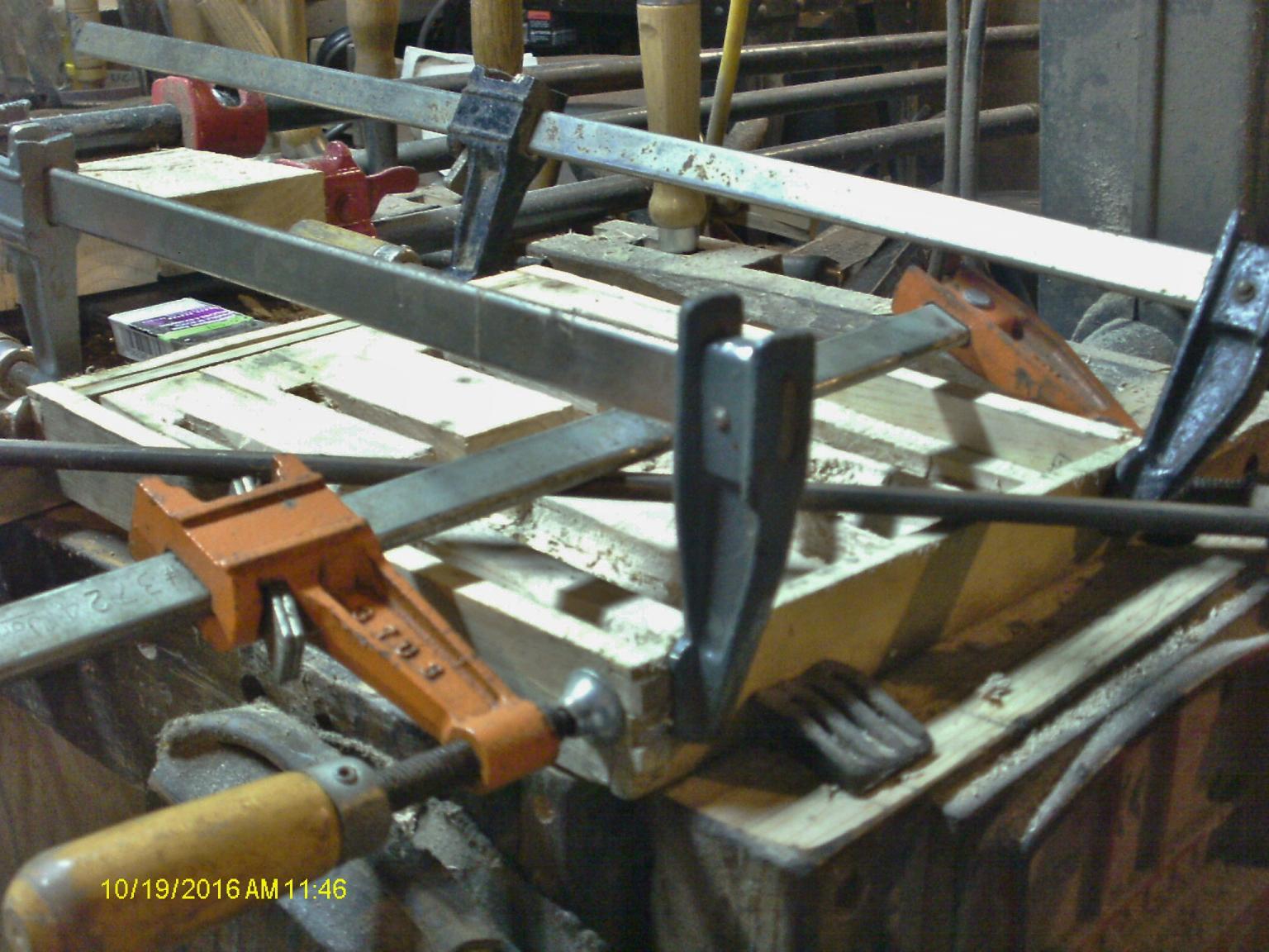 Ok, back to a bit of woodworking. Now that the internet "issues" have been fixed, I might be able to post a few items.. I got holder blank #2 into the clamps this morning Only needed three chunks, this time around. Will let this sit awhile. Now that a certain machine is about ready to go.. I might make use of this yard sale find. As for maxi-mouse? meh, save it for saw plates. Next, needed to cut the sides to match the holder. Ran a pencil around a bit, then a combo square to mkade some lines.. Plan is to cut along the line. Then, add the smaller piece to the holder already made. This will be the "bottom page" of the book. Needed to add some slots to the holder. Marked a couple lines where each shank was, cut a knife line to guide the saw. Then saw as much as I could. Then use a couple chisels to chop the waste away... Something like these two. Small chisel to chop, 1" chisel to pare away the junk. Finally got all the slots chopped and pared.. These slots will allow the bits to be raised up enough to be taken out of the holder. Did some trim to fit on the narrow sides and end pieces. A spot or schmear of Elmer's, and some 1" brass nails to add each side piece. Then...more clamps, including one to pull things into almost square... The one at the diagonal. Even using the end vise and a benchdog to help out. Will let this set a while as well......bench is a bit too full right now, anyway... If'n when I can see the top of my bench again...I'll start drilling the second holder.......have a different scheme to try out, drill wise. stay tuned