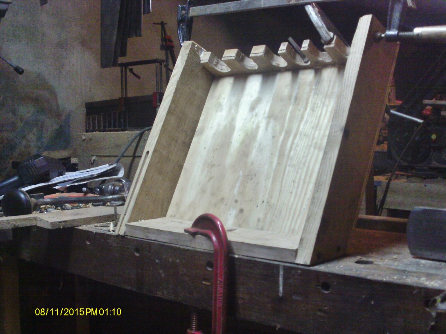 Braces were just sitting around, collecting sawdust. Had a stack of scrap wood to use up. So...2@ 1x4 of oak for the sides. Piece of 1/4" plywood, Piece of 1x4 pine, and a 1/2" x 4" piece of Sycamore Cut the ends of the Oak pieces at an angle. Jack plane to even the two up in a matched set. Screw them to a cut down plywood back. Already had a notched "keeper" from another project start/stop...Added a pine base. Had to plane the edge to match the plywood back. Screws and glue...set it up A look at the angled part. Just eyeballed the angle. couple of counter-sunk screws and a spot of glue. Plywood back was screwed to the sides. BTW. Had to use the jack plane to true up the edges of the plywood, bandsaw still can't cut a straight line. Now, about that keeper to hold the chucks in? A bit of glue, and a few screws from the plywood side. The piece of Sycamore scrap? Well, I tried a forstner bit to make a few more of these slots, VERY DULL bit, or very hard Sycamore. Finished the slots on the bandsaw..HEY, I finally found something it could cut. Two screws and some Elmer's and a test fit.. Red clamp to hold this thing upright. Second keeper is to keep the braces from falling over on each other. Counter sunk three more screws into the pine base. Cleared a spot over behind the grinder, had to displace the 1''x30" beltsander. Start loading it up.. Had to make sure it cleared the old vise, as well. A better look? Hold six of these things. Still have another BIGGIE one in the Tool Chest #2. Not sure about a finish, just yet. just using up some scrap wood...
