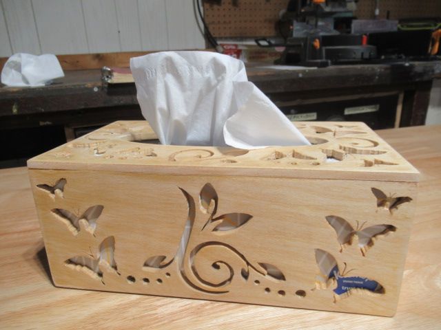 Since my working with power tools has had to be considerably reduced because of health issues, I have gotten in the shop for some smaller projects. One is a model build of a Chris Craft speed boat and another is a scroll saw cutting and assembly of a tissue box cover. The Chris Craft did consume a bit of time. The whole hull assembly was done in two layers, the first layer using balsa wood strips' and a second layer using mahogany strips. The tissue box was cut using 1/4" birch plywood. This was my first attempt at using the Delta scroll saw for anything more than practice.