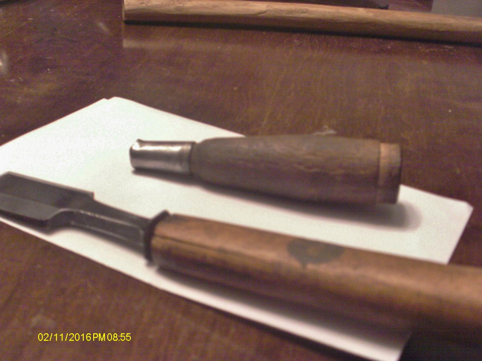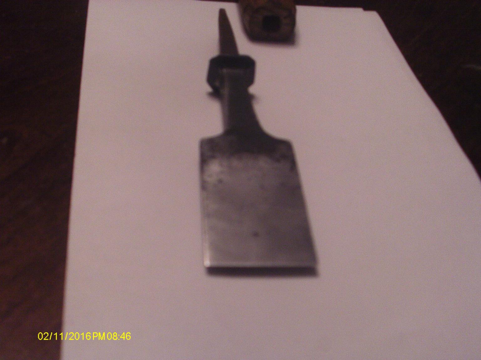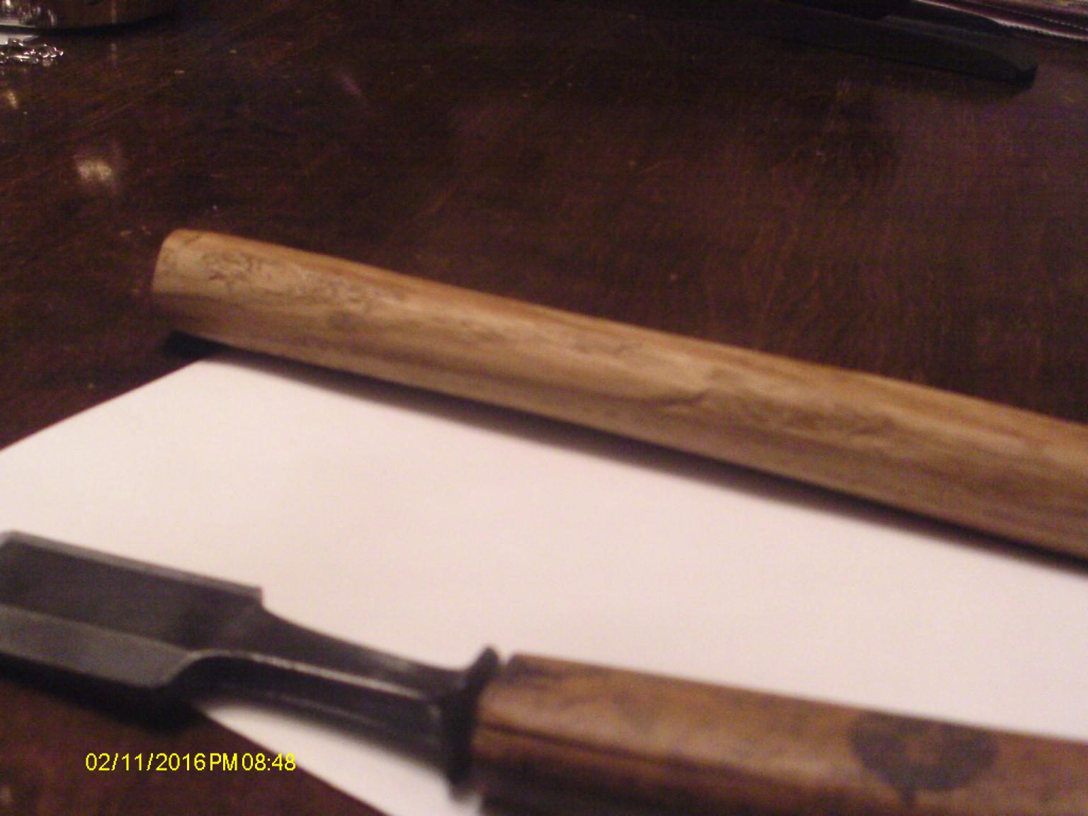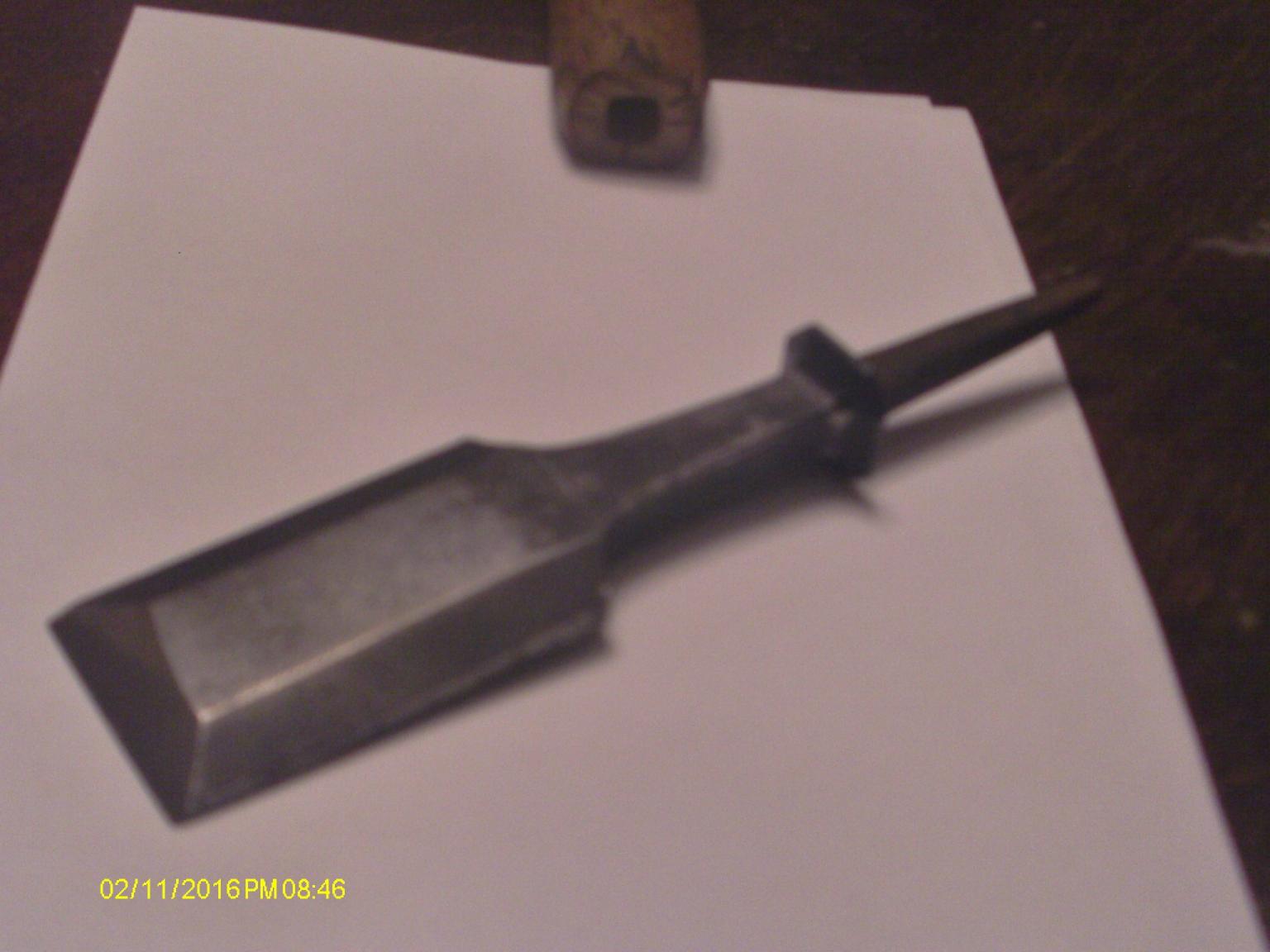 Sometime last Yard sale season....I picked a strange looking chisel up for..maybe fifty cents had a cigar band style label, or did at one point in time. Looked like either a Japanese chisel or a Butcher....Handle was splitting at the tang's end. Got to cleaning this "thing" up.. Found some markings on that flat area.......C E JENNINGS with an arrowhead under that, and then a "Made in USA" below that. I also got the back all polished and flat. Should do for now. well a Jennings handle for a tanged chisel did NOT look like this handle.. And, at first, I was going to just cut a hunk off of an Ash hammer handle I had made ( awaiting a head for it).. Then I saw a handle down in the spares box. Seemed to look a bit easier to use, and was closer to what was on the chisel when new decided to use it instead, and save the ash handle in case I break a hammer handle someday. While cleaning all that black junk off of the steel of the chisel....sandpaper slipped off the end.....thumb merely bounced off. Looked down at the thumb.....had a nice slice, and it was leaking, to boot....OW! Got the tang all nicely cleaned up, didn't have a torch to heat it up....drove the tang in anyway, trying to drive it straight... Well, still about 1/4" from seating all the way in....try again tomorrow. As for the old handle? Had an old "Corsair" 3/4" chisel that needed a handle......cleaned the blade up, and installed it into the "old" handle. Nose is full of dust, as I ground the end a bit to match the Corsair's blade. Sharpened it up, and can use it as a "beater chisel" Thumb is healing...there will be a mark. Fifty cent chisel? handle was from one of those "Junk Box" things at a yard sale. Will post a completed chisel picture later. Without cutting a finger this time...