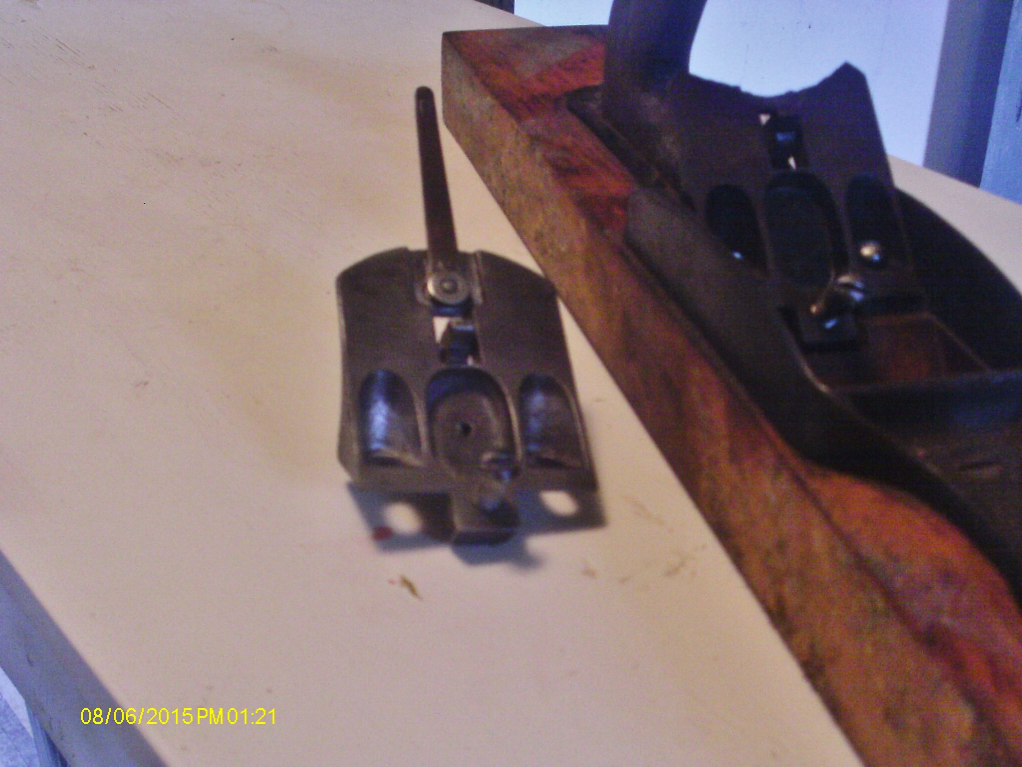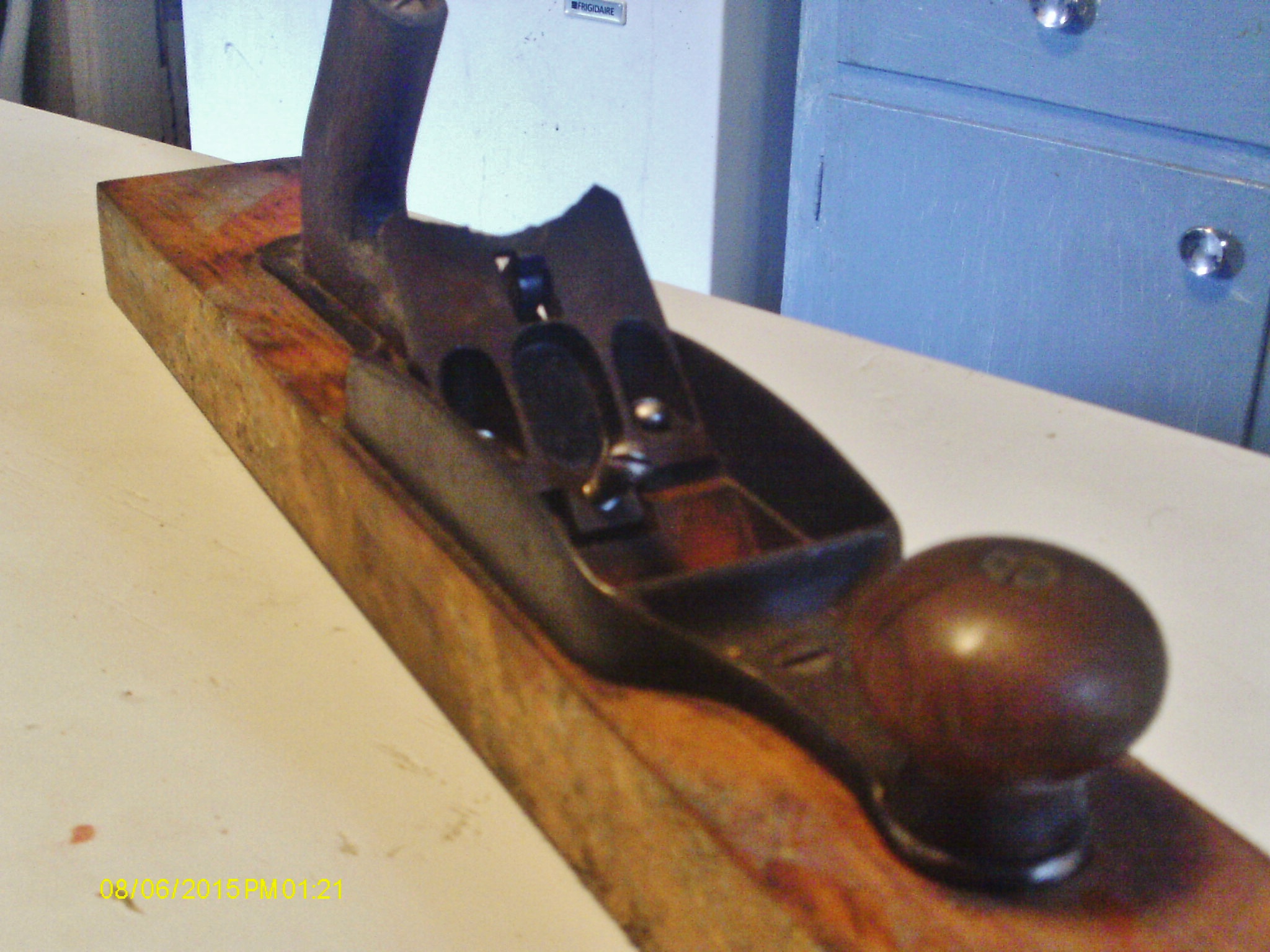 Awhile back, won a pair of Stanley planes at an auction. The shorter one is a Stanley No. 28, the other is a No.29. Same irons, just the 29 is SUPPOSED to be 2" longer...Rehabbed them up, to present to Polite Company Pretty, ain't they? Well, the #29 had "issues" Look at the nose. there should have been a logo and a model number there. It was, until someone had sawn off over an inch, you can still see the saw marks! Other issues? rear handle was not only missing the top "horn" but was broken in two. Dug out another handle, walnut one I made for a #5 iron bodied plane. It had an extra hole for a toe bolt..ok we can add that feature. Drill and tap a hole, and install the "new" handle But, there was another bad issue with this plane Ah..yeah. Missing the lateral lever, and the area where it sat. Won a "new" frog on FeeBay @$15 counting S&H. Came in yesterday, covered in silver spray paint.. Took awhile to wire wheel all of it off, they even painted the brass wheel! Grrr. Anyway, here tis.. Which left me with two wheels to clean up Not even sure which is which. Frog was sold as a No. 28....the No. 29 takes the same frog. Installed the "new" frog, set it up flush with the bed for the iron That tab where the lever cap bolt stick out of. Supposed to be flush with the wooden "ramp" bed. Soon to be changed. Had the plane all back in one piece, tried to set the depth of cut.....1/8" would not go back in...happen to set the plane down next to the Minty No.28.....nose end of the 29 was that 1/8" lower... Bed was worn in front by that amount, but not in the rear? I could add a shim like sole...zero to 1/8"...too much trouble. Decided to just back the frog back as far as it would go. It made the iron tilt back at the top. Closed the mouth a bit, too. More to the point, the cutting edge of the iron was barely sticking out. Adjusted things a bit, tighten everything down. set up a white oak test track. First couple passes...nothing, adjust again..Next few passes? That is much better. No even a sign of chatter, too. Curlies even tried to wrap around my wrist. I think the issues have beenfixed enough to make this a usable try/jointer plane? Just maybe??