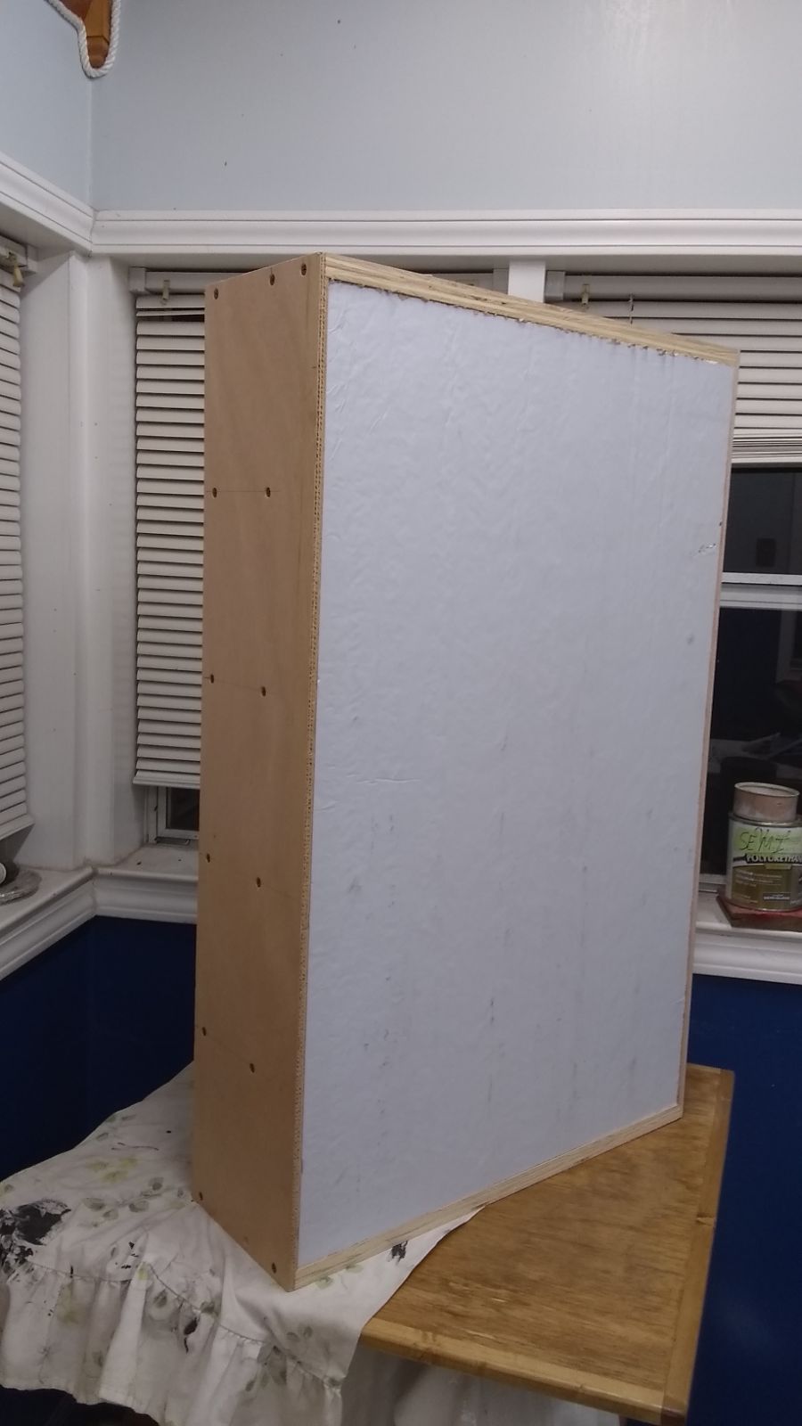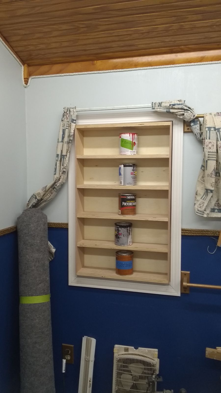As the finishing room comes along I continue to focus on having finishing supplies in it that I typically use. Brushes, trays and such I have taken care of with my supply cabinet build. Now I need a place, or places to store actual finish stuff. Started with 1qt containers. The window faces the back of my yard so no big deal blocking it off, no loss of direct sunlight. Because this once housed a hot tub I went with storm windows. I could install the correct windows and all, but that cost more than I want to invest at the moment. So I got some 2 inch thick insulation from my neighbor. That comes to R-6, half of the R-13 in the walls but not bad. I designed the cabinet to fit into the window and hang out about 2 inches. Set the back about 2 1/8 inches to account for the insulate board. This was tonight's dry fit. This is back of the unit that faces the window. Plan to seal it off with shrink plastic like they do boats with when all the finish work is done. Outside temp of the glass was 42F, this was inside the unit after 3 hours.