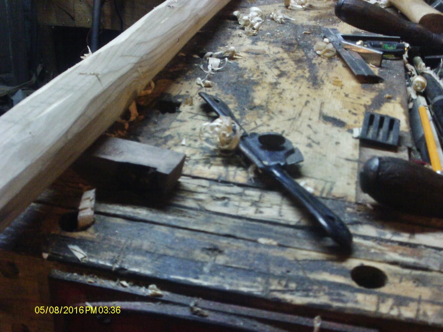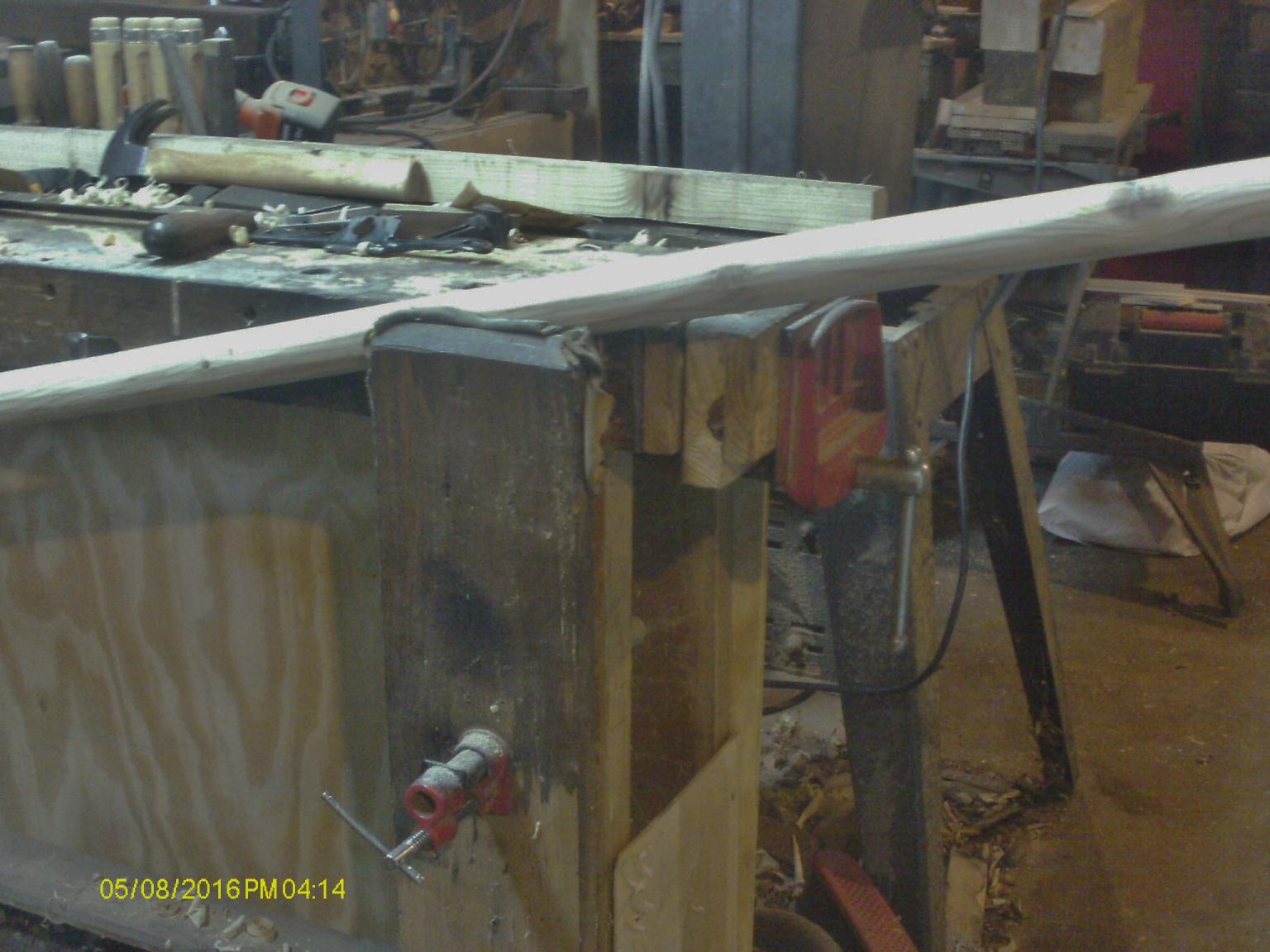 And it seems like I have to "turn" two parts without using the lathe? Lathe barely holds 3' between centers, parts are 4' long! Sooo, how do I intend to "turn" two parts? First off, this is merely a pattern. Secondly, those long,round things in the back? Those are what I need to make. Got a few older tools out today.. Two Drawknives. You can see how I have been using them. Knots kept getting in the way, too. Got things roughed out, one corner at a time. The rotate to the next. I also cleaned the round parts up with another old tool.. a Stanley spokeshave, Flat soled, and the only spokeshave I have. I had a clamp at the far end of the blank. You can see a small block of wood under the near end. Had this blank near the edge of the bench, Easier on my knuckles that way. I'd knife the corner almost round.. Ugly, but getting there. I'd then come back with the spokeshave until it was round.. There was a few dippity-dos along the length, that a #4 plane could take care of. Got all but that spot under the clamp done.....since there isn't a shavehorse in the shop, we adapt.. There is the head of a rail road track nail sticking out back from the leg vise. This way, I can finish that 12" or so on the end. Took awhile today, but I have one of the two long parts all rounded up Nice, if you like knots. One down, one to go. There are a pair of short parts, at least they will fit on the lathe.....unless I wish to match the back two parts' "look". have until this fall to finish the chair, at least I have a start. At least i know where I will do my "cardios" at...stay tuned....