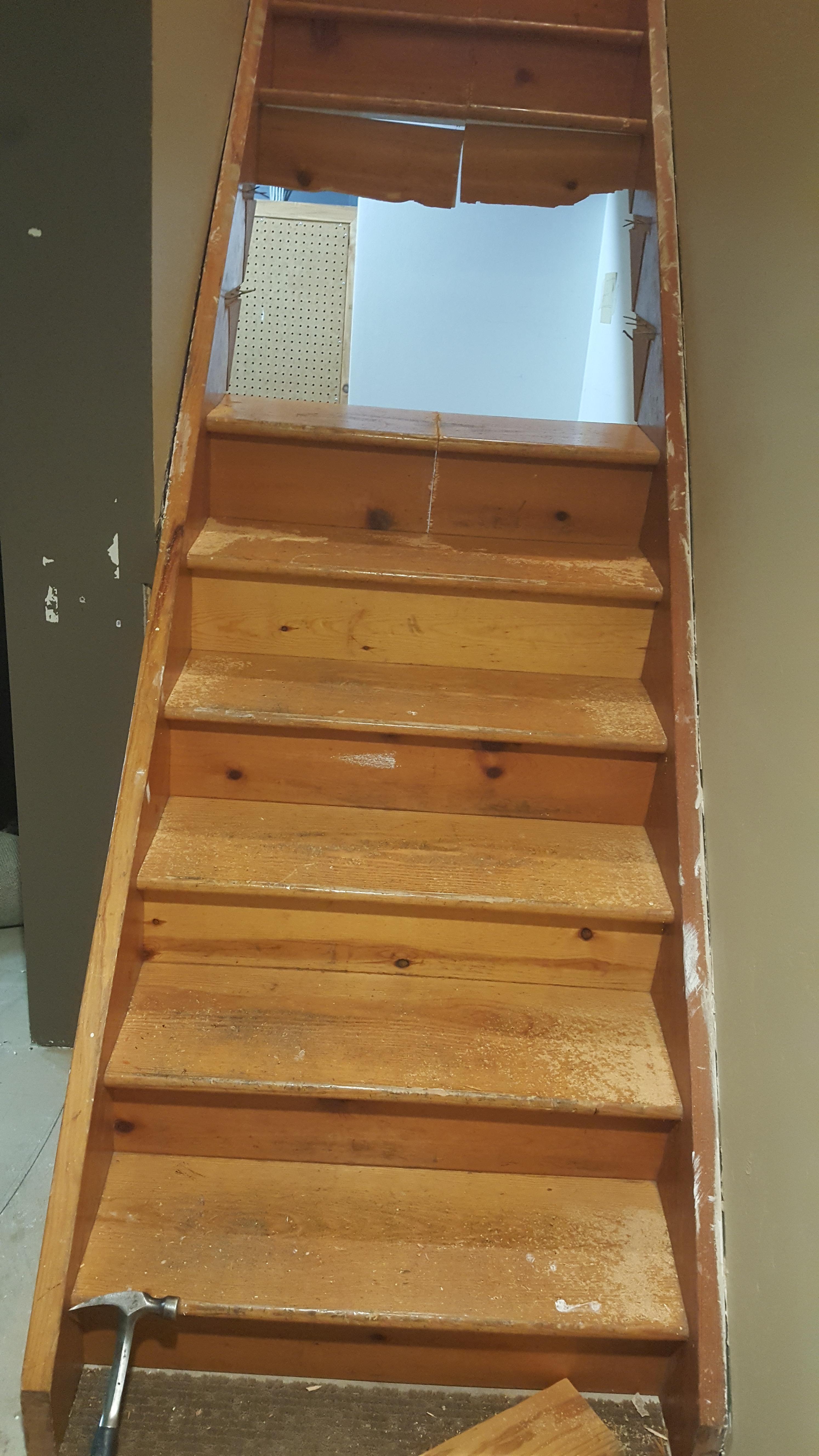 these stairs were covered w/ red shag carpet, loose (no shims and 8d finish nails) and the riser heights were random... the treads were re-positioned, risers adjusted to fit and center stringers added... Both sets of stairs are kicked/racked ¾" the opposite way of each other... The 1st risers of each set were 7/8" low and the top 2 risers are 7/8" tall.... the fix was to change the elevation of the stairs... pulled everything out and reinstalled them to required height... I'm sure the original installer didn't allow for the finish floor elevation... This project received a new front door and a tiled landing.... pressure sealed (same process as PT'ing wood) the threads and handrail w/ Rexthane, plus 2 coats and started the installs... all of the newels, baullisters and railing were shop produced... this work got me a lot more around the neighborhood...