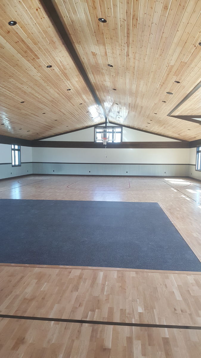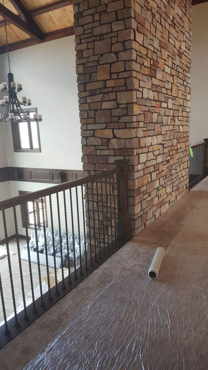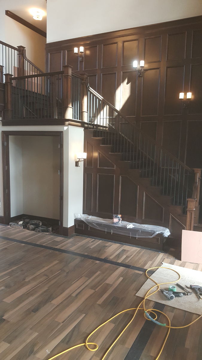 Put these stairs in about 2 months ago, the painter finally got them stained and varnished, we put the ballusters in this week. Did the stairs and all the balcony rail, foundation was dug 2 years ago, will be about 6 more months before the basement gets drywalled, and then we can put the 2 basement stairs in. The basket ball court is above the 6 car garage!