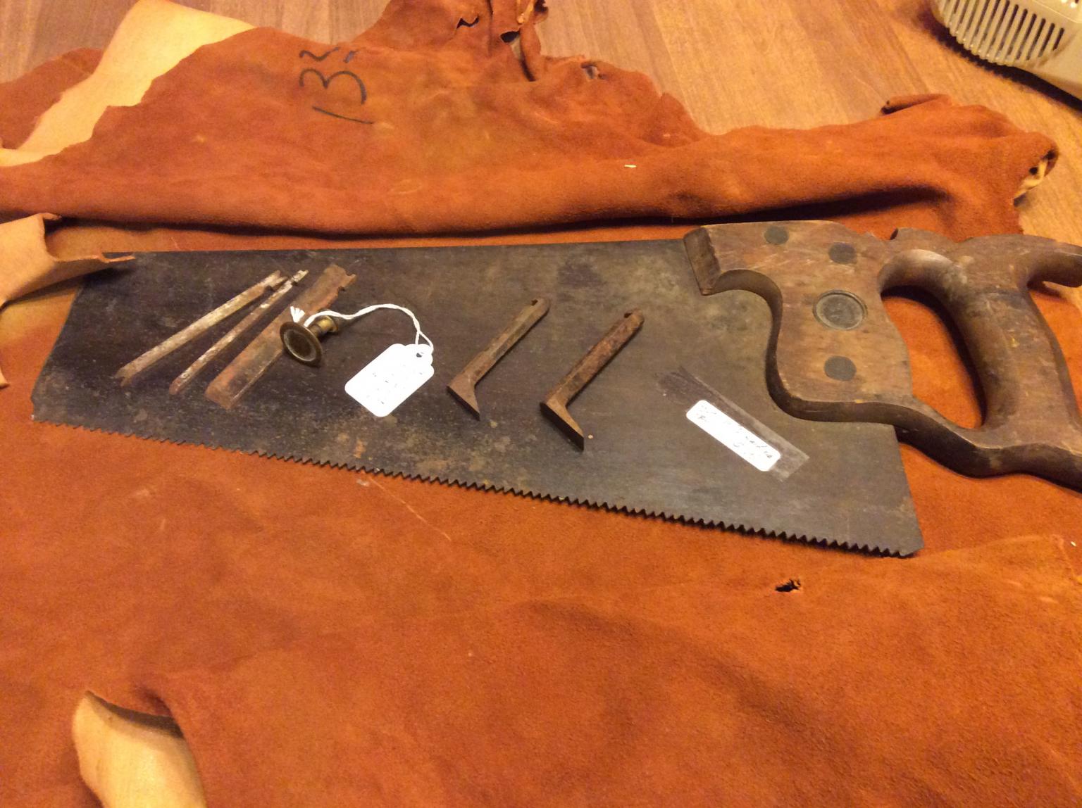 It was too cold in the shop yesterday and my 7 year old daughter was "SO BORED" in the house that I suggested a trip to the local antique mall to hang out for a bit. To my surprise, she agreed, so we went and did a little rust hunting. Although I cant say that we found much in the form of complete tools, it was a fun afternoon for her and I plus we did come home with a few useful and unexpected items. I was only in for 14 bucks for the whole day and 25 cents for gumballs. Our treasures included 2 router plane cutters that will fit nicely in my Stanley 71 which had none when I bought it, a few irons for the Stanley 45, a medallion for a Simonds saw, a full leather hide to be used for whatever projects may come, and an old WS badged with split nuts. The saw is a bit of a bummer as it was shortened to just the far edge of the etch. I really bought it because I certainly have use for the split nuts and handle if I choose not to clean up what is left. The etch is visible enough to make out Brown Cast Steel number 3 and the keystone emblem leading me to believe it is a Disston built saw.