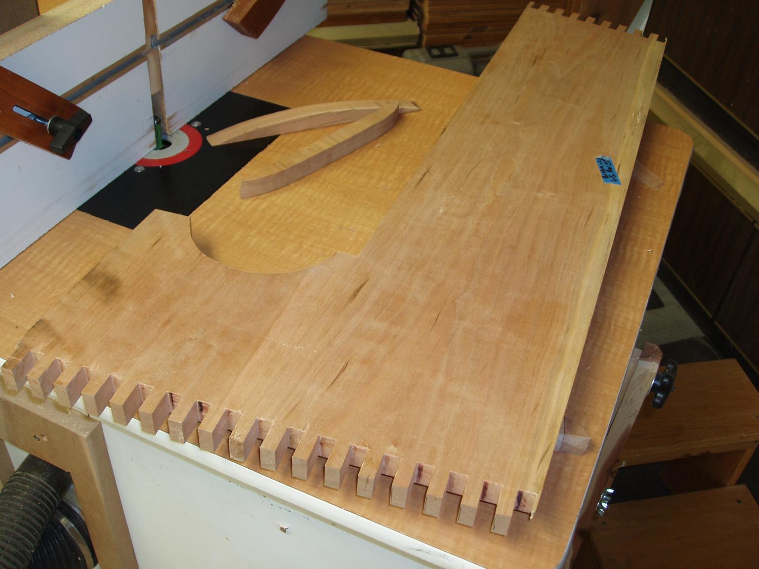 I have PIP photos of several projects and this is one I was very proud of. This is a cradle I made for our grandson 12 years ago and he is almost as tall as me now. Mainly went by a NYW plan. I changed the rockers slightly and added a star inlay, for which I wrote him a poem which his mother framed. This is the side with finger joints cut. and shaping . This is the template I made for the star. A little practice . The finished inlay. Fit together and sanding. Rockers added Finished product Yes he did sleep in it a couple of nights. and they still have it.