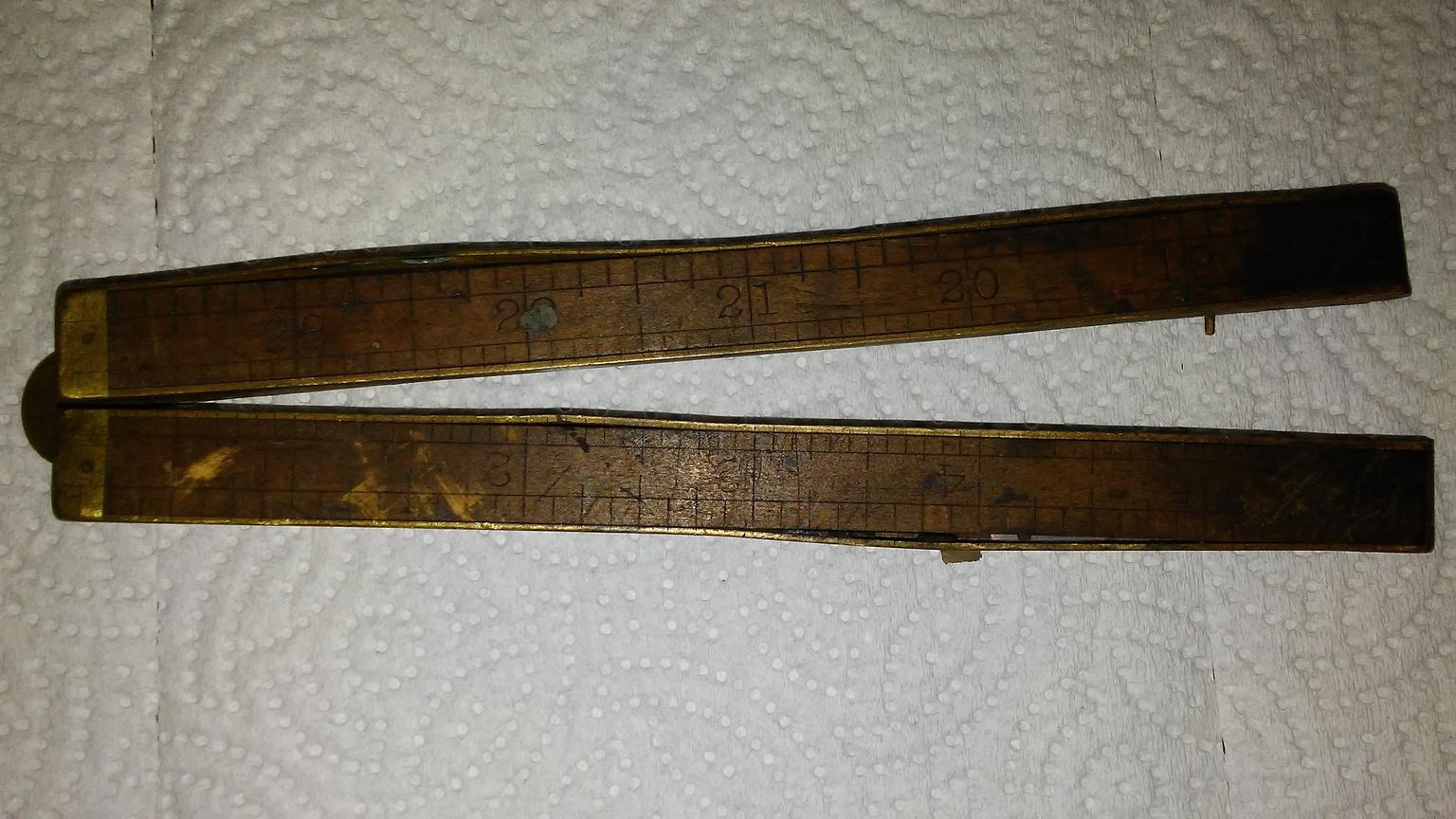 I had some time to kill late Friday afternoon waiting for my wife to get off work so we could pick-up the truck from the transmission transplant. I hadn't been to the local flea market since well before Christmas...Pretty much the same 'ole, same 'ole. On the way out one booth has a variety of tools but most are of little value. I did however stumble upon this laying under some junk. @John Moody you wanted proof and more details of the find. So you know, I trudged out to the garage today, 18o, wind blowing, barefoot, waist high snow, uphill both ways to find my magnifying glass. Here's the results. How did I do? This is a "four fold" right? Any ideas on the approximate age? I hope to clean it up a bit but not ruin the patina. I stumbled upon an article Chris Schwartz wrote about how he cleaned one using diluted oxilac acid wash I'm not sure yet how to reattach the brass strips but was thinking maybe CA glue? Thoughts. Stanley-Sweetheart No. 62 Boxwood & brass folding rule; Besides the U.S.A. it is stamped Boxwood. Only one of the three alignment/latch pins remain; brass edge strips have pulled or been pulled from brass pins; some debris under the strips Thanks for looking.