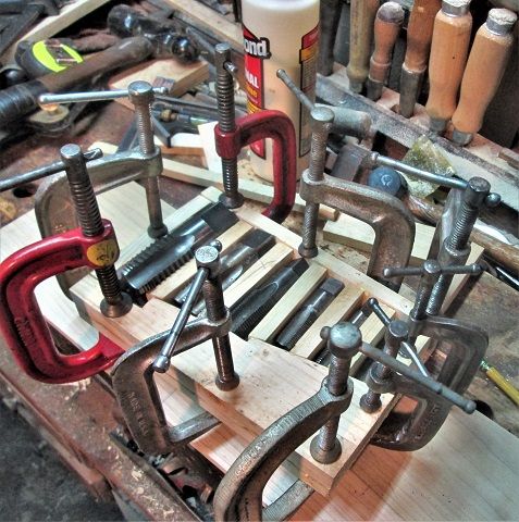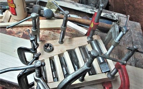 So....I still have a set of Pipe Thread Taps..and a single Die...that also would like a box to call their own.. . Will select the best out of the "extras"...and go with a 6 pc set of taps....1/8", 1/4", 3/8", 1/2", 3/4" and 1".....and hauled those to the shop....extras went into a drawer in the Small Tool tool chest. Set them out onto a backer board, and arrange things a bit....kind of stair-stepped them out.....needed to find a good angle to set things up at....so... Needed to reach a ways...Then ripped apart a pine 1 x 4 scrap....lots of cuttin-n-fittin going on....couple pieces were recycled because the size cuts were a tad...off..a Monday thing Finally about to glue and clamp a holder of sorts, using the taps as spacers to get things close...almost... Glued to the Poplar backer board. There is still a spot for the pipe die to sit in... Drill a 1" hole for that....still room for any other Dies that might show up. Let this mess sit a day, then start building a small box around it...won't be quite as big as the main set... Stay tuned...