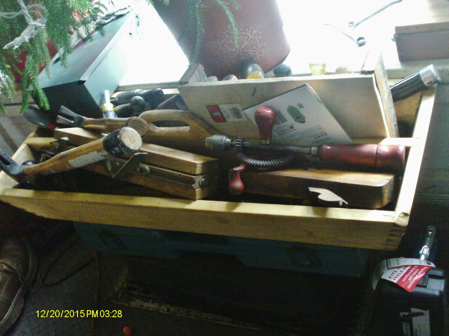 Legs look fat, top might be a bit thin..Boss is thinking "Night Stand" Still needs a finish.....have to go and BUY a can of something....this is a side view... Lonely looking thing. This is an end view Thinking MAYBE a darker colour for the legs? Kind of blend things together? Still need to get a box organized, as it is getting a bit full.. You might look through there, and see what kind of tools this will hold.....That smaller box with yellow handles sticking up, holds a set of chisels.....I need to find out what is stashed back there in the steel tool box....