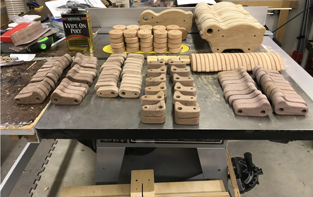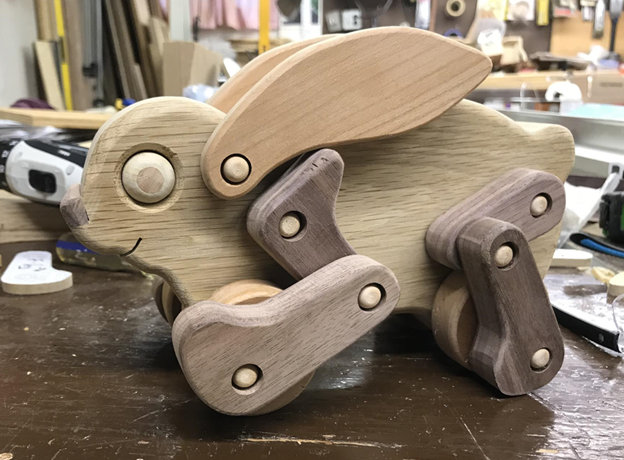 I wanted to make an articulating toy for the US Marines annual Toys-for-tots Christmas program this year. The plan was to design a toy and make ten of them. Well, I am not making a design, but I did purchase a plan to make a walking rabbit. I started work on the pull-toy rabbit. Originally, I thought I would use a scroll saw, but quickly aborted that idea and ordered a 1/8” blade for my bandsaw. The bandsaw left a nice surface finish but not nice enough, so I had to order a variable speed sander. I’m making do with my drill press drum sanding system instead of purchasing a spindle sander. Another project will have to justify that tool. Learning to use the scroll saw effectively, would have taken more time than what I wanted to expend. I sent an email to a Smallpatch asking for tips on the use of a scroll saw. He replied with a lot of good information; more effort than with I wanted to take on. Thank you Jesse, I did appreciate it. Perhaps when Covid is over I will visit, and you can give me lessons. The prototype rabbit can be seen here. Pulling the toy moves four wheels which moves the leg bones which make the ears flop. I decided to make eleven Rabbits and give the extra one to my granddaughter. For eleven rabbits I had to make 396 pieces. Someone in my area was giving away some walnut, oak, and cherry cut-offs. He had numerous small pieces 10" to 16" long. Win, Win, Win. He got his basement cleaned-up, I got free lumber, and some kids will get hand crafted pull toys. The plans used metric dimensioning so I had to do some figuring. I used seven different drill sizes. to keep each hole as small as possible, but I may have to open a few when it comes assembly time to allow everything to articulate correctly. I hope to have this project completed soon. I need to get it done before the new interior doors arrive. Thanks for looking. Danl