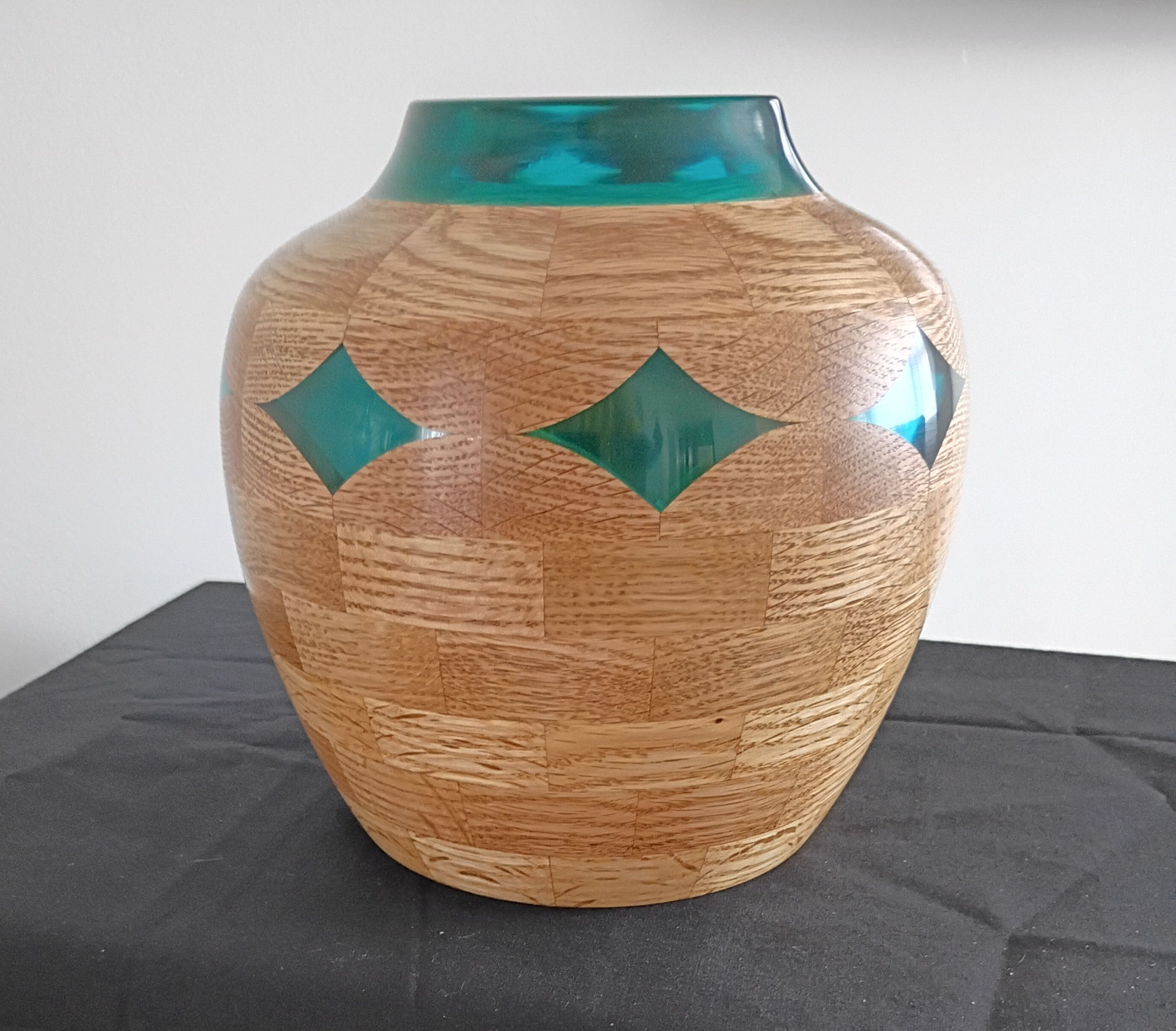 I have made several vases using polyester resin, I like the stuff and the brand I use but it has a tendency to EXPLODE. You may recall some of the events I posted that caused one to opt for a fresh pair of BVD's . After asking around a bit I decided to try "epoxy" resin and picked a new brand to try. The vase here is red oak and epoxy resin colored with alcohol ink. It is wonderfully translucent using a bit of emerald color ink. Best of all I find it turns ( with carbides) far more forgiving and a lot easier on the tighty whities budget . It did seem a bit more work to polish up but I attribute that to the translucent ink opposed to the opake mica powders I typically use. So far I am pretty sold on the epoxy formula but time and mor pieces will tell. mike calabrese55