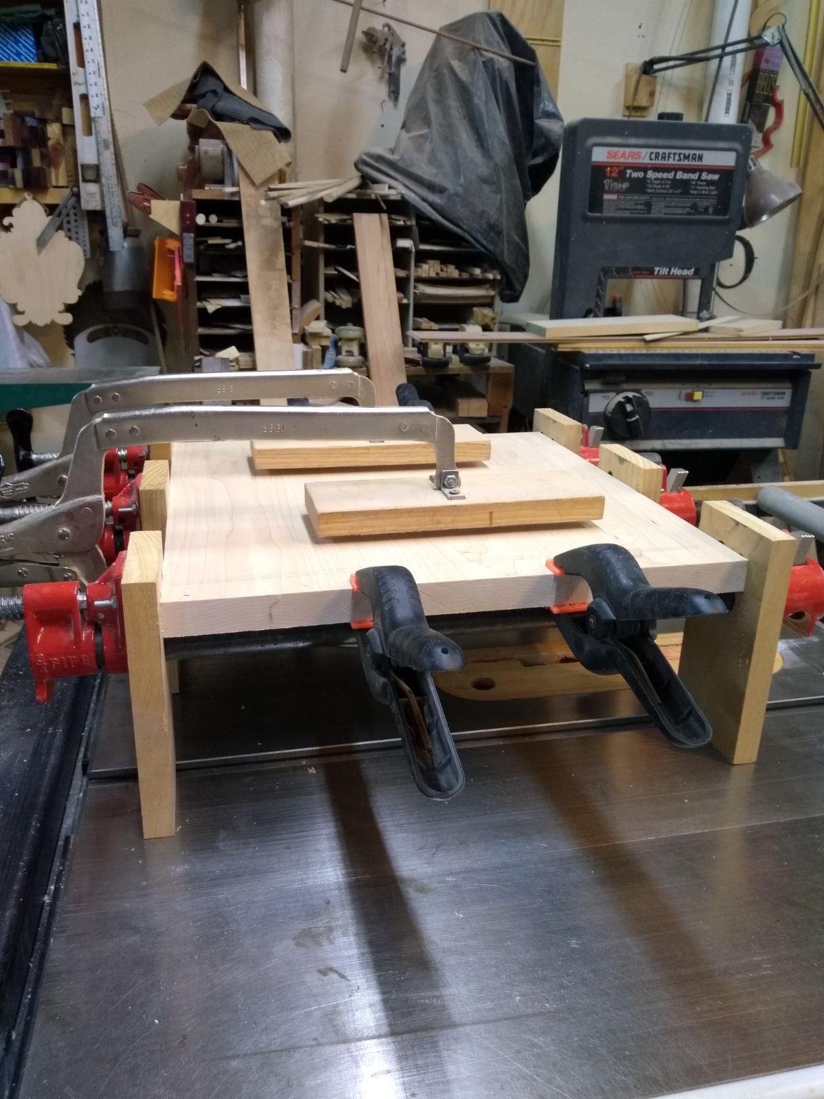 I'm gluing up 3 pieces of maple so I will be ready to put the picture pattern on to the wood. Not ever being a woodworker but sold oil field equipment all his life he wants to know every thing I do when I first start with a project because none of the tools and equipment are familiar with him but does have the money to get what he needs. I wasn't that lucky or that smart when I should have been getting smart so I could face life in a more easier fashion. I had planned a bunch of pieces of ruff maple last summer so I was ready to cut the pieces to length, run them through the jointer and glue them up. This is the clamps I use to keep everything in line or else I would have to use the drum sander to get it all flat so I could sand it smooth. This was glued up yesterday so this morning I took the clamps off so I could do the scrapper thingy to the extra glue squeeze out. I then replaced the clamps so he will see what I did before he gets here. And after using the clamps and the card scraper to remove the dried glue I didn't even have to run the piece through the drum sander or use the electric hand sander either... Not being a smart --- for it has taken me years of learning to do the things now that makes wood working a pleasure to do. After removing the clamps I will start with applying the clear Scotch brand shipping tape to one side of the glued up boards. I then will spray the glue on to the clear shipping tape with the glue that will secure the picture so I can scroll saw the picture to pieces. I started doing it in these steps because after I moved on to larger projects. I use to spray the back of the patterns but I ruined a few pictures because before I could smooth the large pictures out on to the wood they would fold over on to themselves and there is no way to pull them apart. Then I had to go and have Rapid Resizer enlarge another picture the size of the wood and the little printer would print out another to use...lots of time wasted there so this was the reason I started spraying the glue on to the clear tape. I try to change everything I did wrong that caused me problems. If guys spray the backs of the patterns instead of on to the clear tape its his way of doing things that's fine with me. It just didn't work trying to install large patterns. So now I get my wife to come in and hold the top part of the picture while I guide the other end on to the sprayed glue thats on the clear tape. Now if its a very small item and maybe I want to carve something thats round and not flat this is what I use. rub it on the wood and stick the pattern on then the residue comes off easy. This is what wife uses when she switches over to her sewing thingy's. More later!