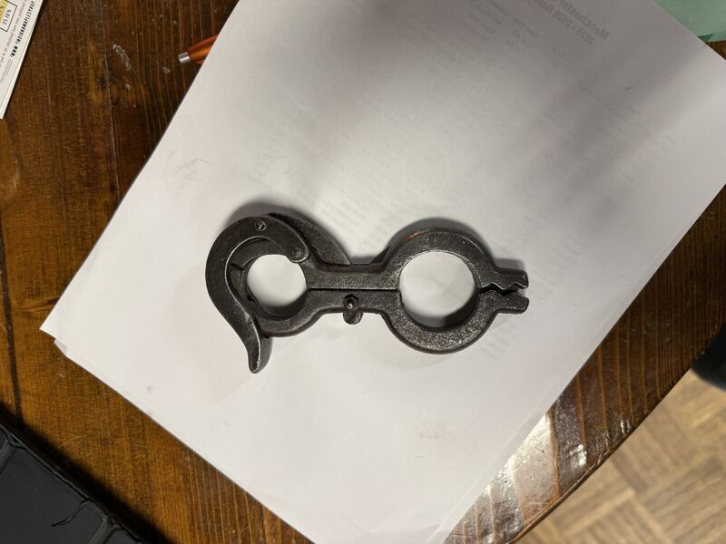 "What's It" Basic Rules Reminder For a full run down on this project and rules please go to: The Patriot Woodworker and MWTCA "What's It" project Only Patriot Woodworker Members are eligible to participate and receive the award. If a verified and referenced answer is not arrived at by the end of each month's "What's It" project, a random draw will be performed for a "One Year MWTCA Club Membership". Only Patriot Woodworker's who participate in this "What's It" topic will be included in the random draw. Additional What's It Rules Unless you are completely sure what this item is, please avoid "definitive statements" that appear that you are without a doubt claiming that you know what the item is. For example stating, "this item is called a "widget xx" used for "insert purpose here". If you are making a definitive statement you must accompany your statement with evidence or proof from a secondary source. An example of acceptable statements within the realm of having fun and educated guesses would be something like this, "I believe it could be", or "It appears it's made for this or that", etc etc etc... Project Details The information provided hereon is all the information that is provided, no further information on this item will be added. Tim Grissom sent us (Tools and Trades History Society) these pictures of a tool his friend in the USA has. Suggestions for it's use have been: temporary nose ring for a bull; some form of twitch; some form of rope handler. We think it is a heavy duty snap hook and may have been used either in boating or in farming for lifting hay or cotton bales. Any more certain answers would be appreciated. Source: see link above -
