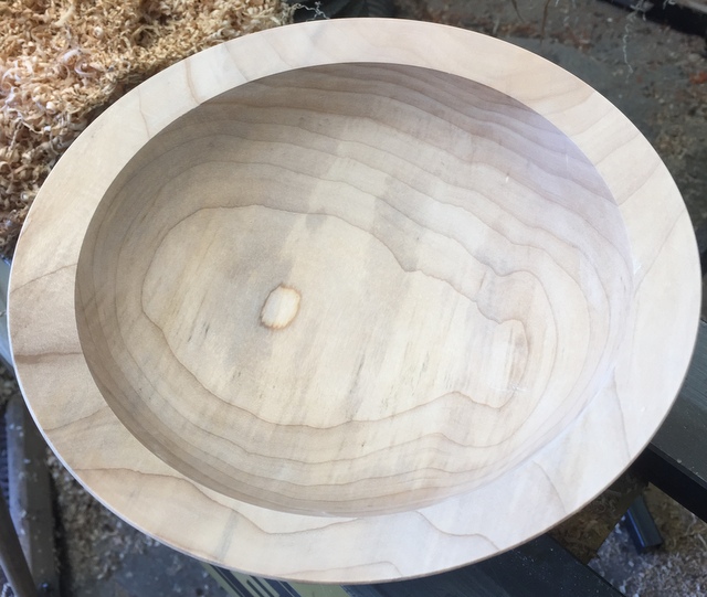Most anyone who visits this forum will know I spent a week at Marc Adams in September. The guest teacher was Glenn Lucas. During that week I had the opportunity to use some of his signature bowl gouges. I was very impressed with the cut I got from them, enough so that I ordered his 1/2", 5/8", and the 5/8" bottom feeder bowl gouges. This is the first bowl I've used them on. It is hard maple, twice turned, harder than nails, and about 9" in diameter. In the picture I have sanded it with 150 grit only. I used a 3" disk in my drill and this is after about 5 minutes. In this picture the rim has not been sanded at all. It is the first time ever I started sanded with anything other than 60 or 80 grit on the inside of a bowl. I could start with 150 grit because there was virtually no tear out, even in the "problem" areas. FWIW, I have since finished sanded the bowl inside and I started with 320 grit on the rim. This is not meant to be a recommendation to buy his tools. I'm sure the techniques I learned from him contributed as well. It's not unusual for me to spend an hour or more sanding a bowl this size. I might have had 15 minutes on this one. Steve