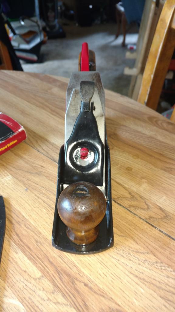 Got the iron back to sharp Cuts nicely, but was hard to hold onto. Saw a place that does refurbs for a living, and they also had an #81.....with a tall knob. Hmmm, well, I can clean off the work bench (10 minute job right there) and drag out the wood lathe, again. Blank of spalted maple was in need of squaring one end, tried to hand saw that. Three different saws.....end was almost square. Fired up the lathe. Plan ( Plan? I don't need no stinking Plan) to turn two bench plane knobs. There was enough room between them to squeeze a block plane knob in there too. All sanded down, parted off, and ready to trim the ends smooth. Beltsander? Nah, it threw one knob across the shop! Ok, narrow belt-sander. Meh..... ONE bench plane knob turned out decently, the other ....not so decently. Drilled hole through all three. About the same results. One GOOD knob. Went and dug up a steel, slotted screw. Installed the Kanoobie on the front porch of the #81, and started coating it in oil well...not too bad. Looking more like a plane, now I did try this set up before the oil went on, Nice and easy to use now. Shavings flew out, even on Oak. Might just be a keeper
