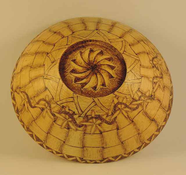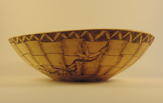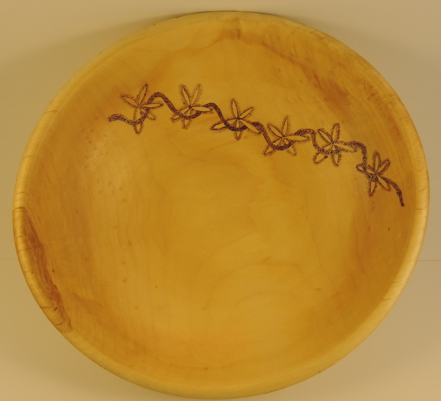 A maple bowl in kind of a tulip shape, 12" diameter and 4" deep. I thought about "framing" the pattern with some heavy shading around the edge, decided not to and just left it plain. I turned this to be functional so it has bees wax for a finish. Steve